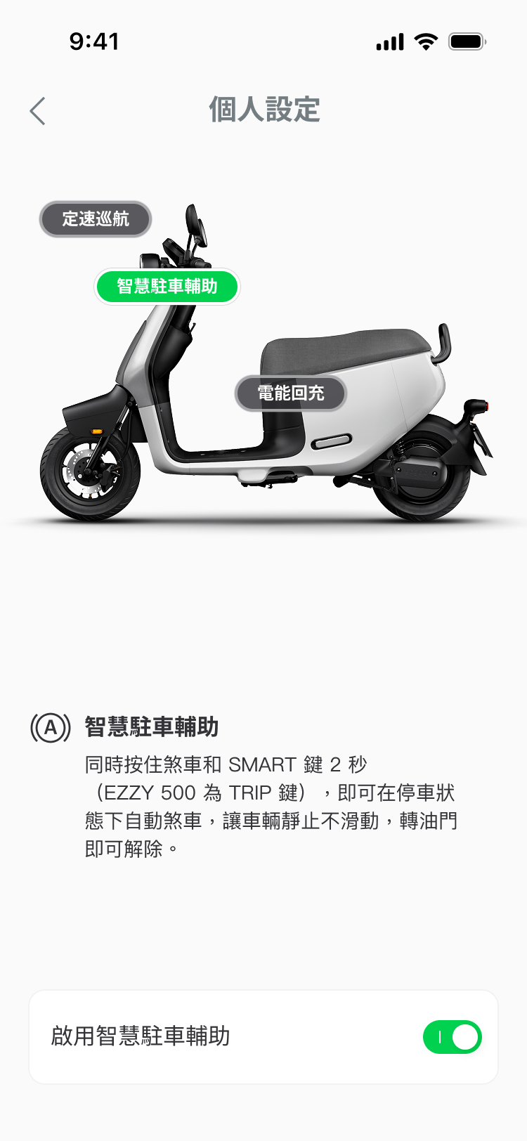 - 此功能僅於「馬達待命」狀態下生效。若您在「智慧駐車輔助」狀態下踢下腳架或關閉馬達,則「智慧駐車輔助」會立刻失效。因此在踢下腳架或關閉馬達之前,務必握緊煞車,以防車子往下坡滑動。
