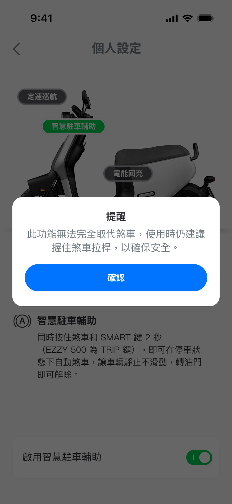- 於車圖上選擇「智慧駐車」並開啟該功能,點擊「確認」