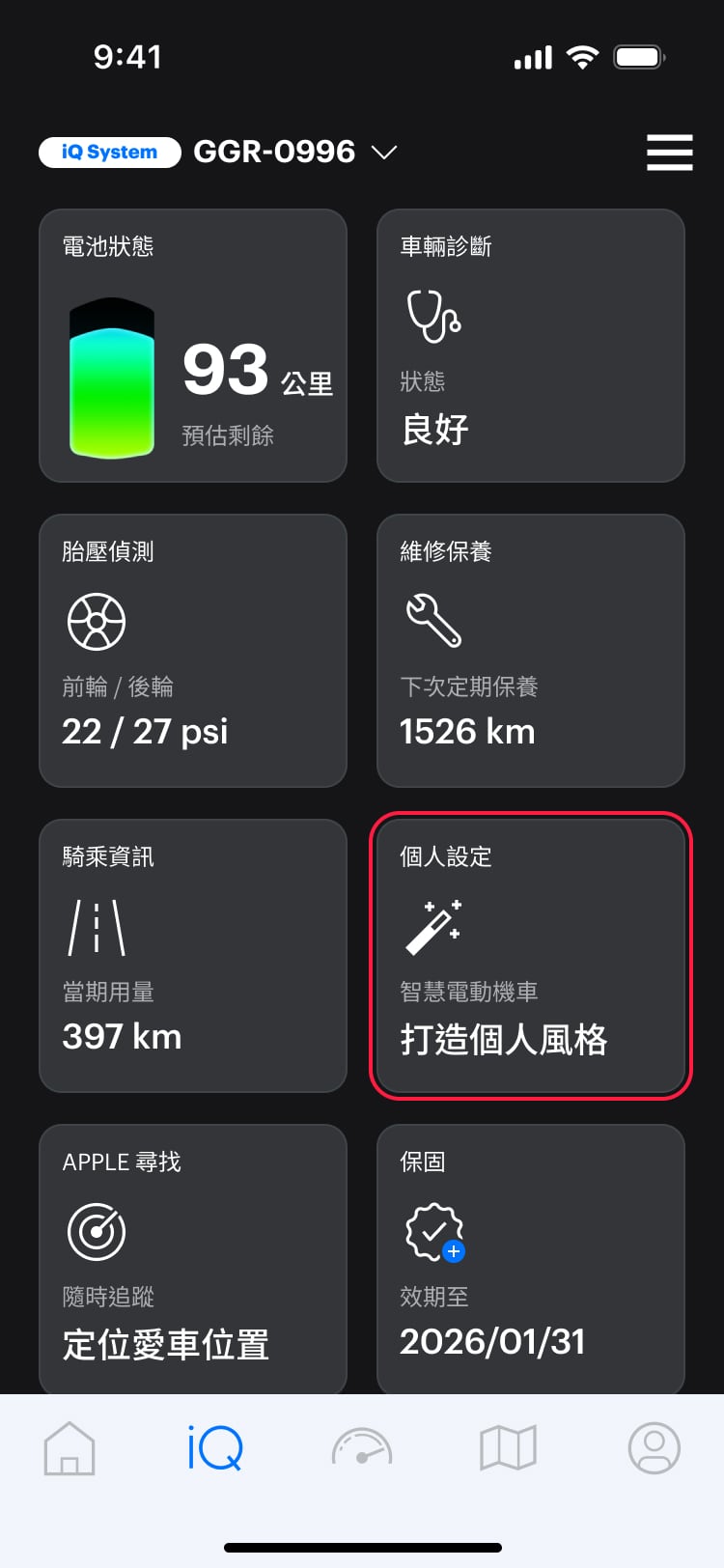- 打開 Gogoro® App 並進入「iQ」頁面